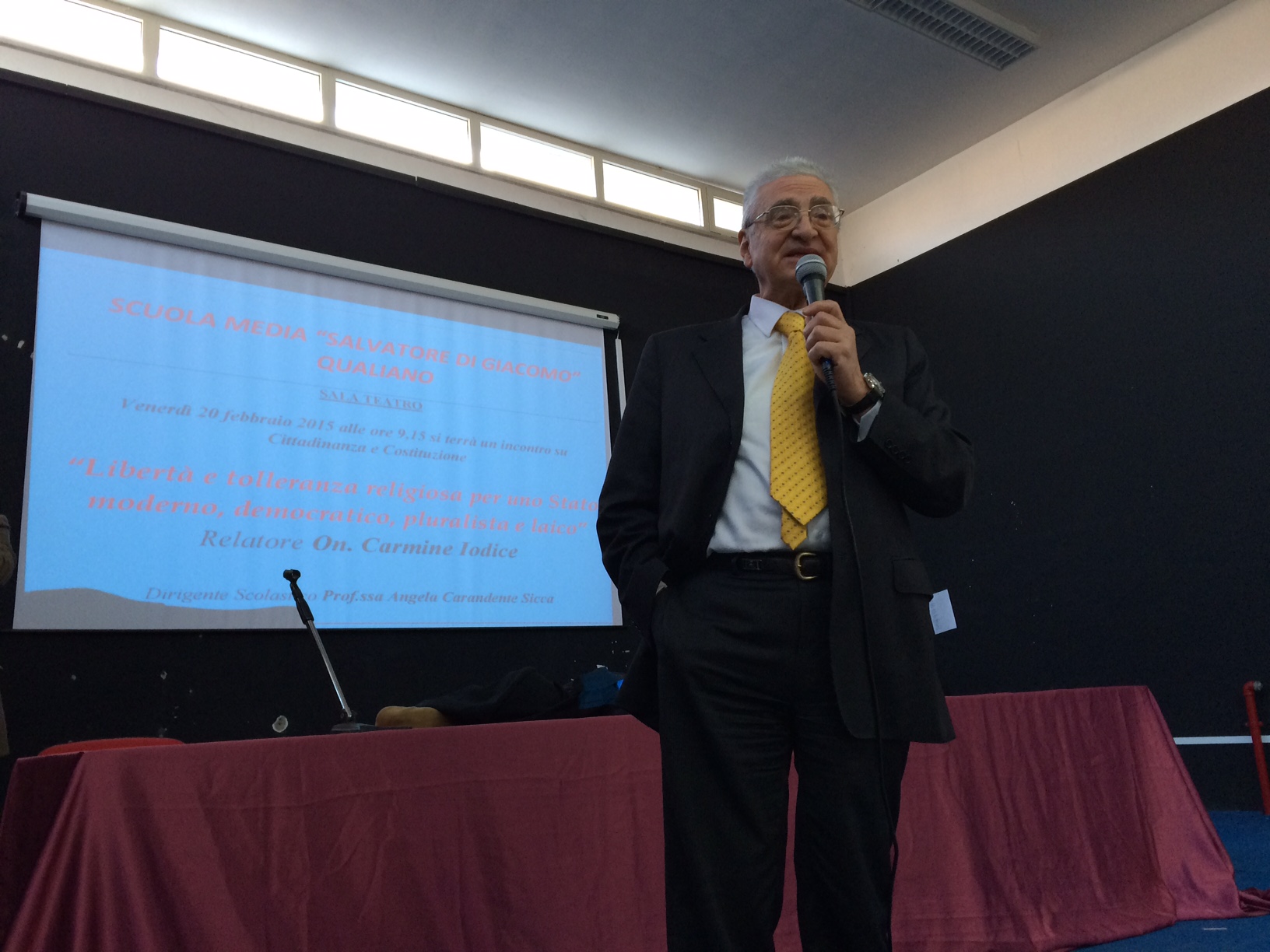 L’Associazione ex Consiglieri della Regione Campania, ha presentato Venerdi 20 febbraio, l’iniziativa Cittadinanza e Costituzione, entrata a far parte dei programmi di studio di ogni ordine e grado della scuola italiana del corrente anno scolastico, come previsto dalla legge 30 ottobre 2008, n.169. Alla conferenza, tenutasi presso la Sala teatro della Scuola Media Statale ” Salvatore Di Giacomo” di Qualiano, con la partecipazione degli alunni erano presenti: il Dirigente Prof.ssa Angela Carandente Sicca, l’Onorevole Carmine Iodice, e il Dott. C. Ranucci. L’AREC, il Coordinamento degli ex Consiglieri Regionali , attraverso iniziative come queste continuano a seguire con attenzione il mondo della Scuola e le tematiche fondanti dei cittadini di domani. “Libertà e tolleranza religiosa per uno Stato moderno, democratico, pluralista e laico tema scelto per quest’anno scolastico, con l’intento di rafforzare la presa di coscienza, da parte degli studenti, sugli articoli principali della Carta Costituzionale.