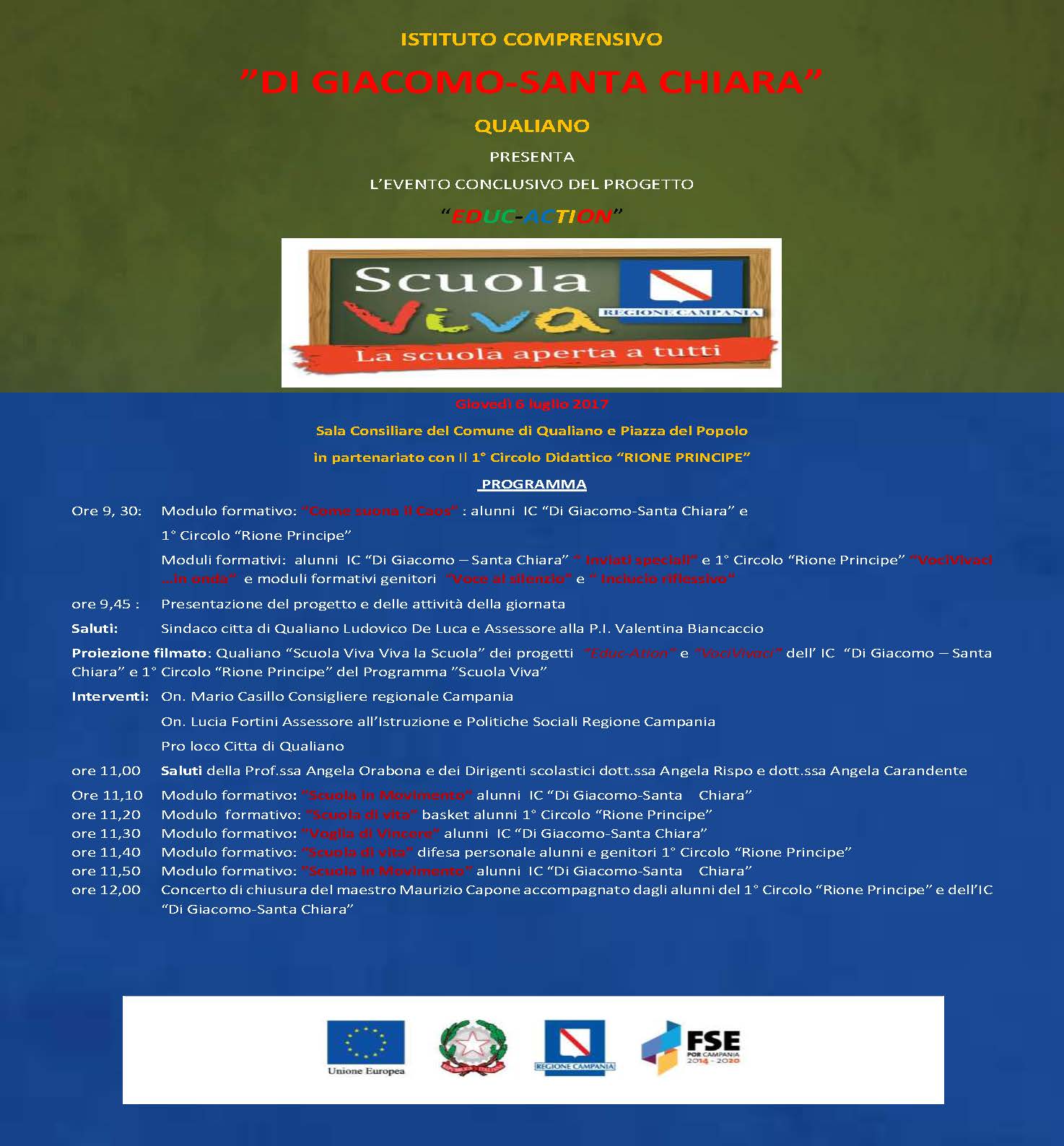 Presso la sala consiliare del Comune di Qualiano e Piazza del Popolo in partenariato con il 1° Circolo Didattico “Rione Principe”, Giovedì 06 Luglio 2017 Manifestazione conclusiva del Progetto EDUC-ACTION